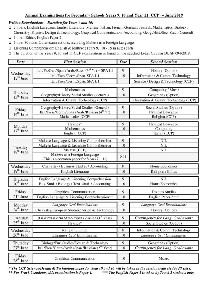 Students are required to take note of the official Annual Time Table for June 2019 and check whether they have any clashes in their options.  Any clash needs to be reported to Ms T Cachia by Friday 12th April 2019.