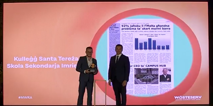 L-iskola sekondarja tal-Imrieħel ġiet l-ewwel fost 40 skola fil-Malta Waste Reduction Awards permezz ta’ proġett li fih ipparteċipaw membri tal-istaff flimkien mal-istudenti. Prosit lil dawk kollha li b’xi mod jew ieħor ikkontribwew fil-progett u li taw is-sehem tagħhom biex l-iskola tikseb dan is-suċċess.
