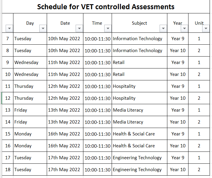 The following image shows the schedule for the controlled assessments for Year 9 and Year 10.